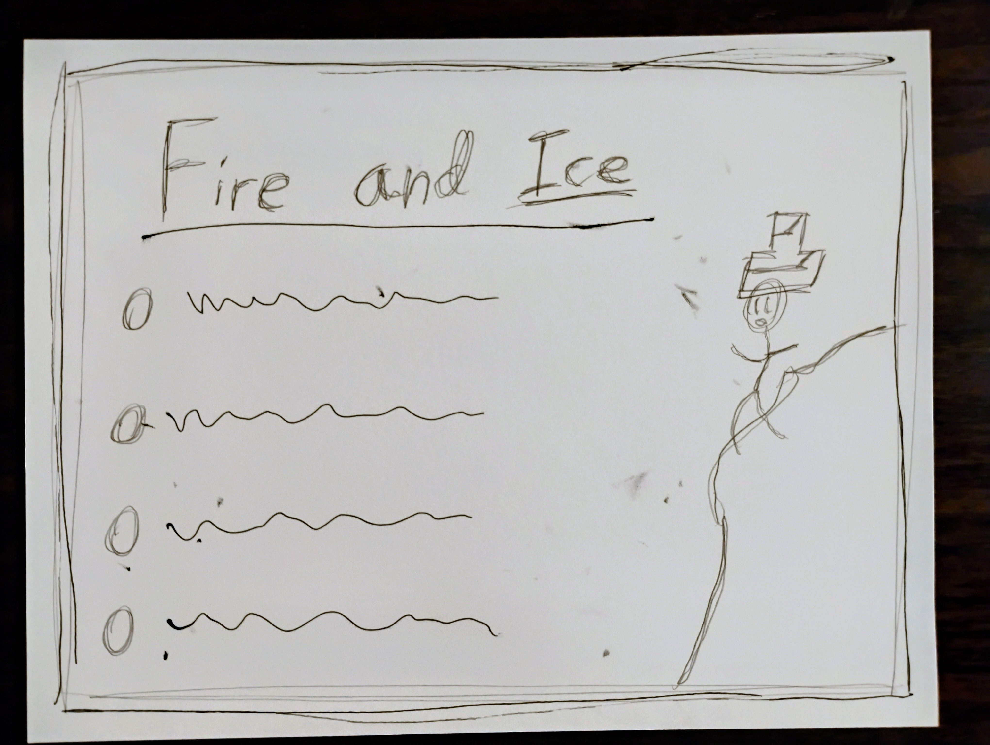 Fire and Ice, hot and cold, ice and day. What?? Did you just say, Ice and day?? … Yes, I did; Fire and Ice, hot and cold, Yin and Yang, Ice and DAY; These truths have been passed down, since ancient times, sorry, I digress… I want to ask you a question; and no, you don’t have to answer. This is the question I have for you; If fire is hot, and ice is cold, than well, fire and ice, must be a chilling fire? Or a blazing, freeze? Have you ever thought of these things? Things, feelings, emotions, that are outside the typical feelings, emotions, thoughts, and desires? And when I say desires, I mean, your instinct; I mean, what is inside you, your mind. Fire and ice, hot and cold, yin and yang; these are all forms of art, yet perhaps I digress.